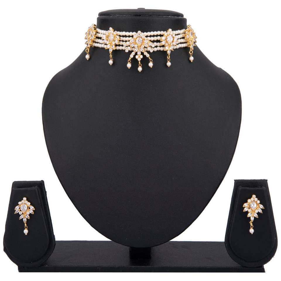 Fashion Jewelry Gold Plated CZ Faux Pearl Bridal Wedding Pendant Collar Choker Necklace Earings Set