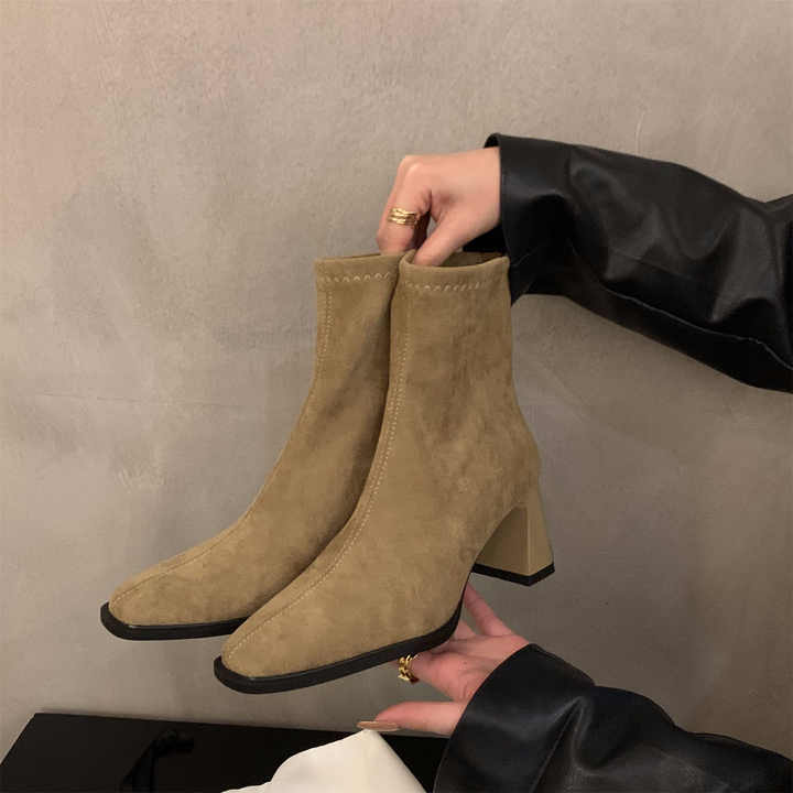 Bottines courtes pour femmes à la mode, bout pointu, en daim, talons épais mi-hauts, fermeture éclair latérale, bottines à la cheville pour femmes