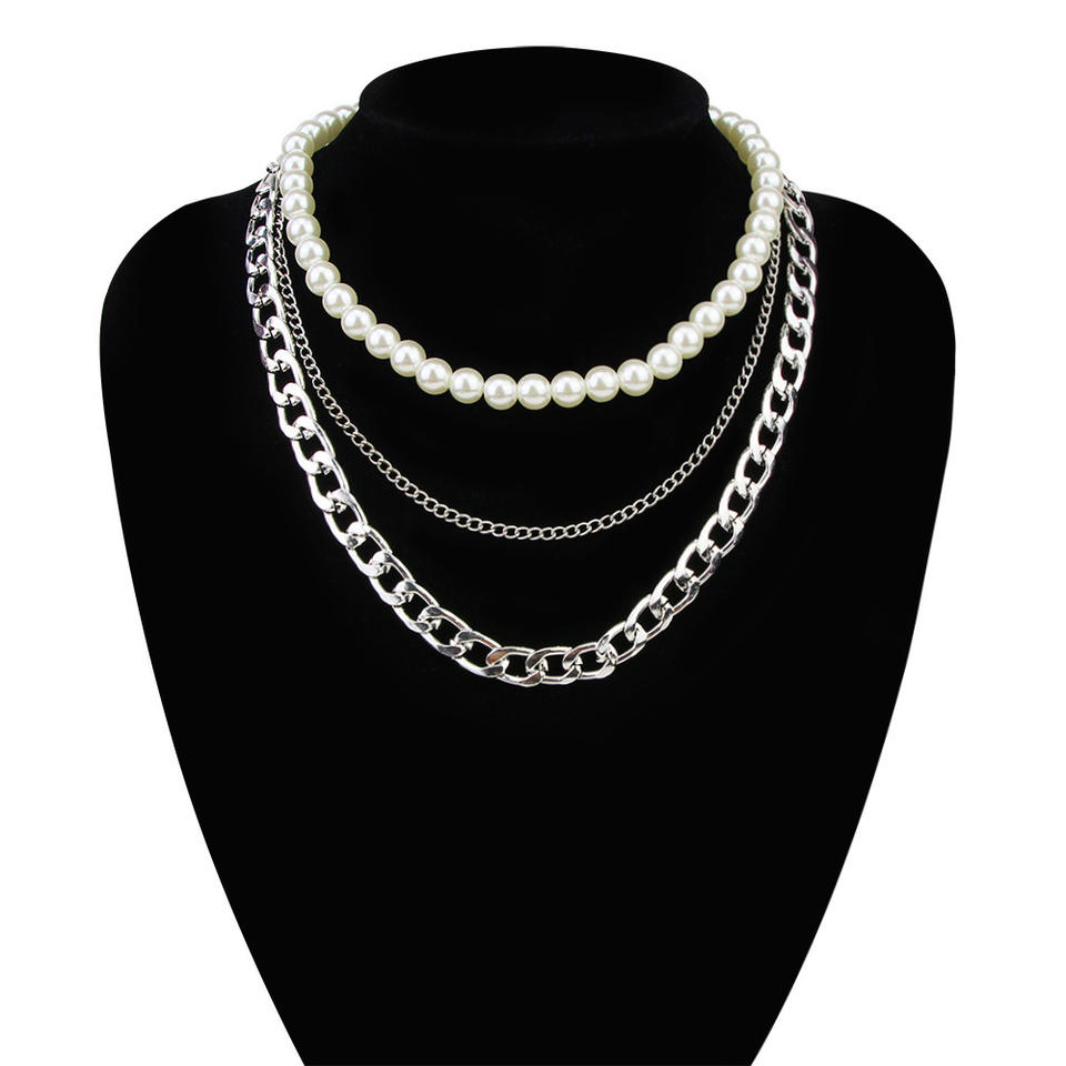 Collier superposé tendance multi-chaînes en alliage de perles pour femme, bijoux de fête, ton argenté et doré