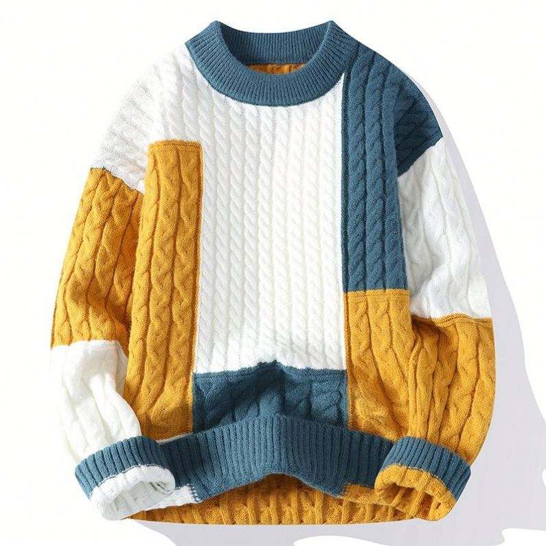 Mode Patchwork Couleur Conception Chandails Ras Du Cou Pull Hiver À Manches Longues Épais Pull Tricoté pour Hommes