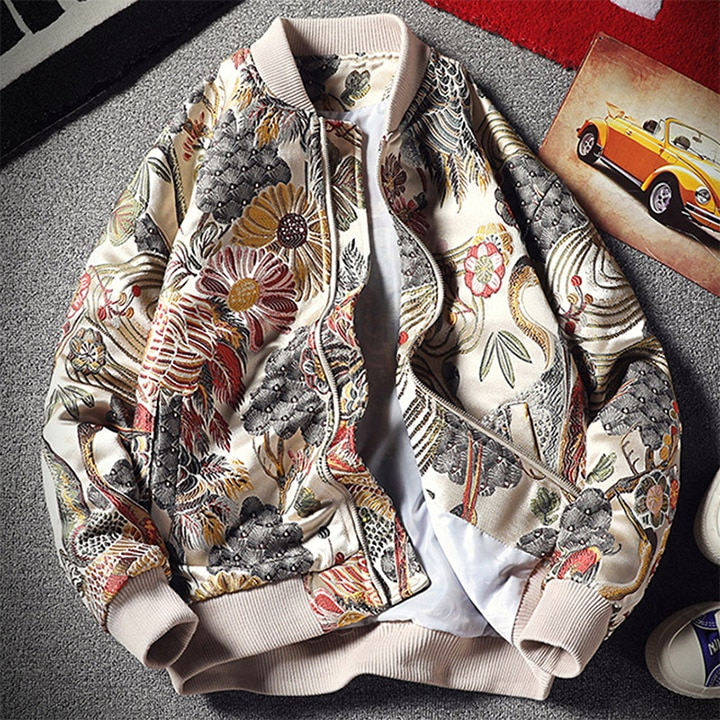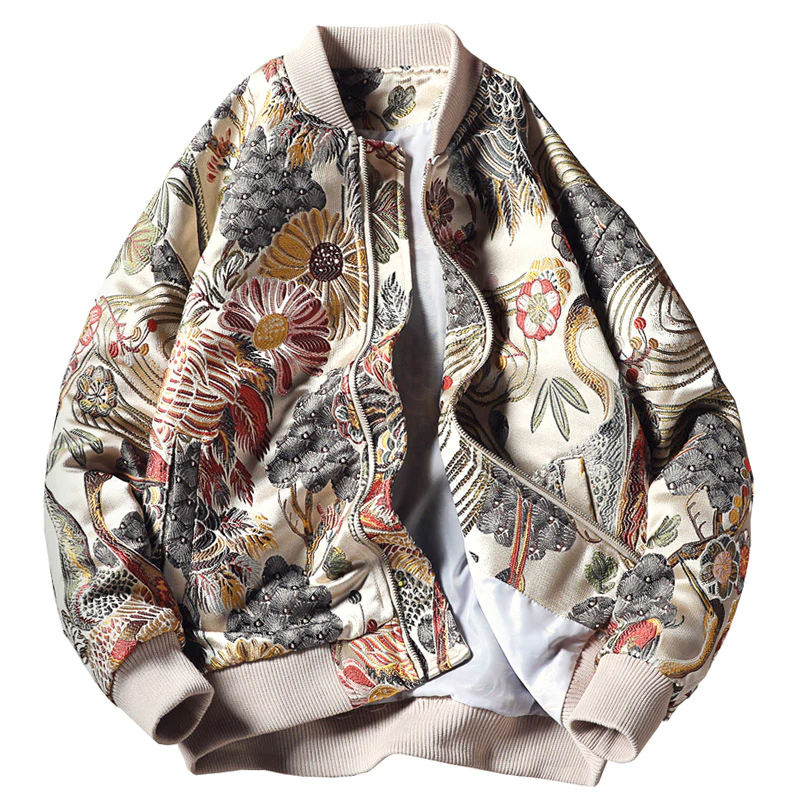 Veste universitaire à broderie florale et de grue à la mode pour hommes col montant veste universitaire à conception personnalisée pour hommes