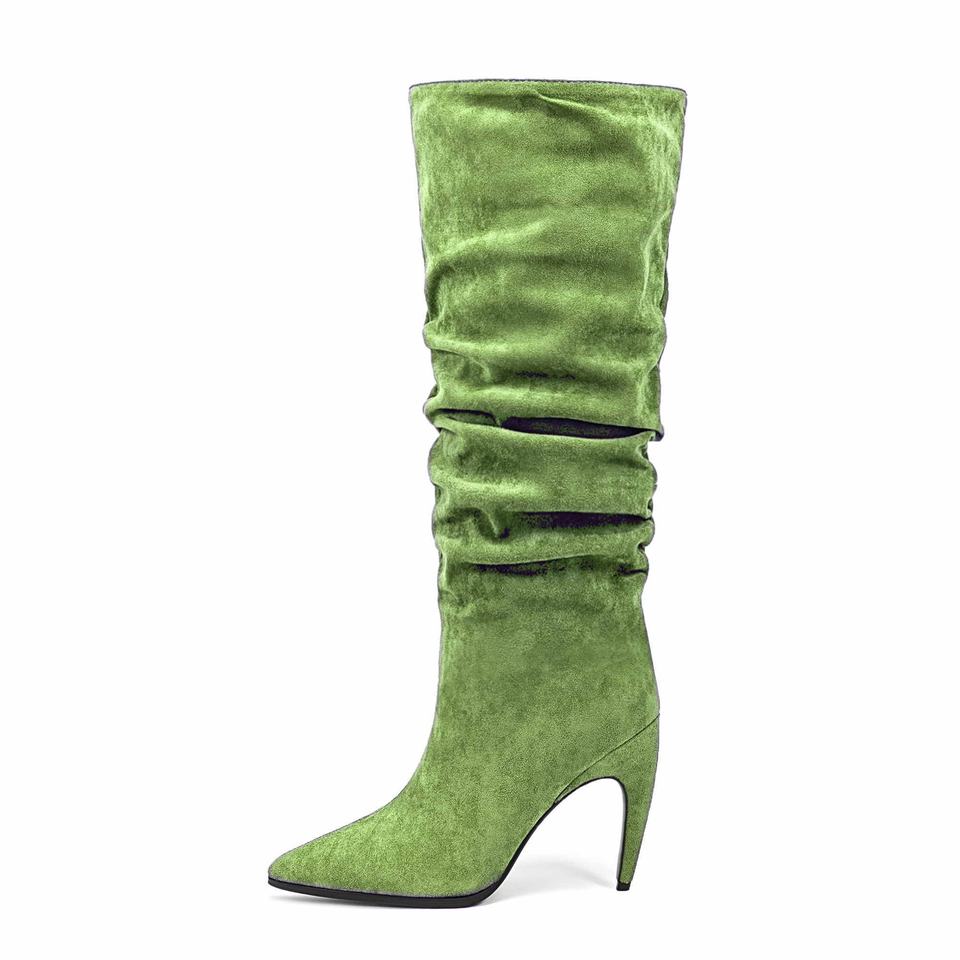 Mode femme Sexy botte bout pointu talon haut dames plissé Faux daim fétiche genou bottes hautes