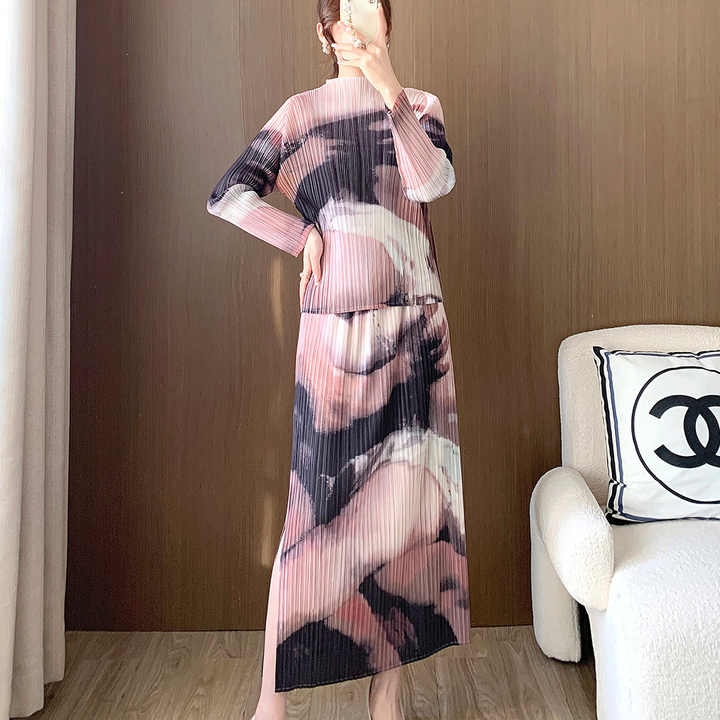 Mode graffiti imprimé costume femmes nouveau design Miyake plissé haut jupe deux pièces costume tiktok vente chaude tenues