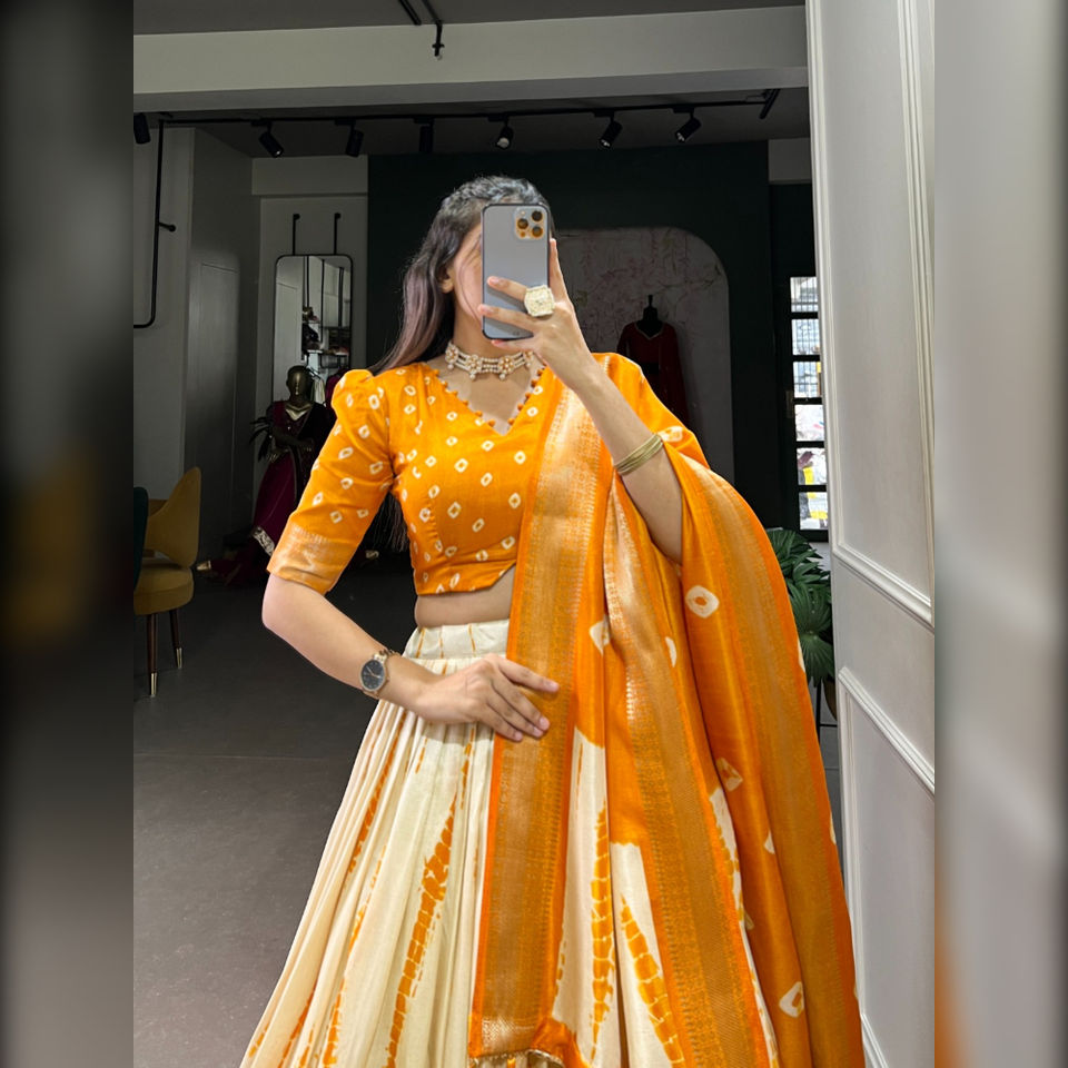 FashionHarbour Women's Dola Silk Lehenga Set Shibori Print with Woven Zari Border for Party Wear in Winter & Summer