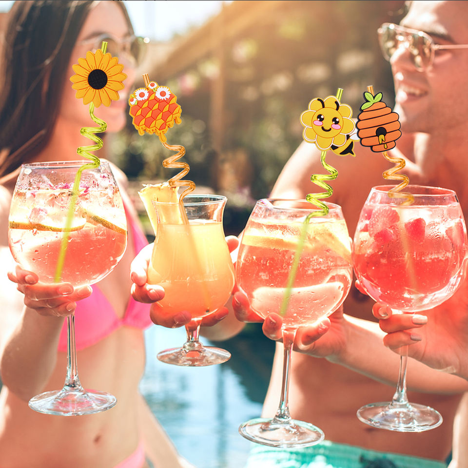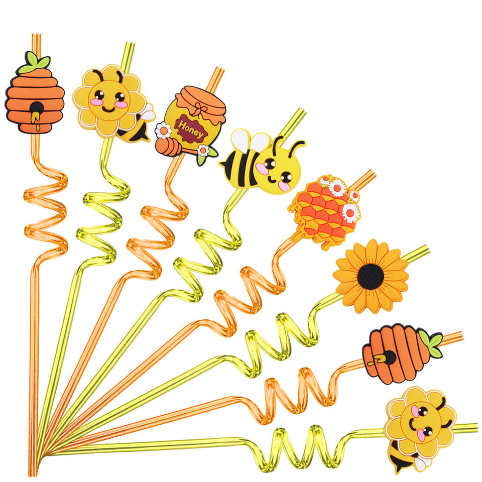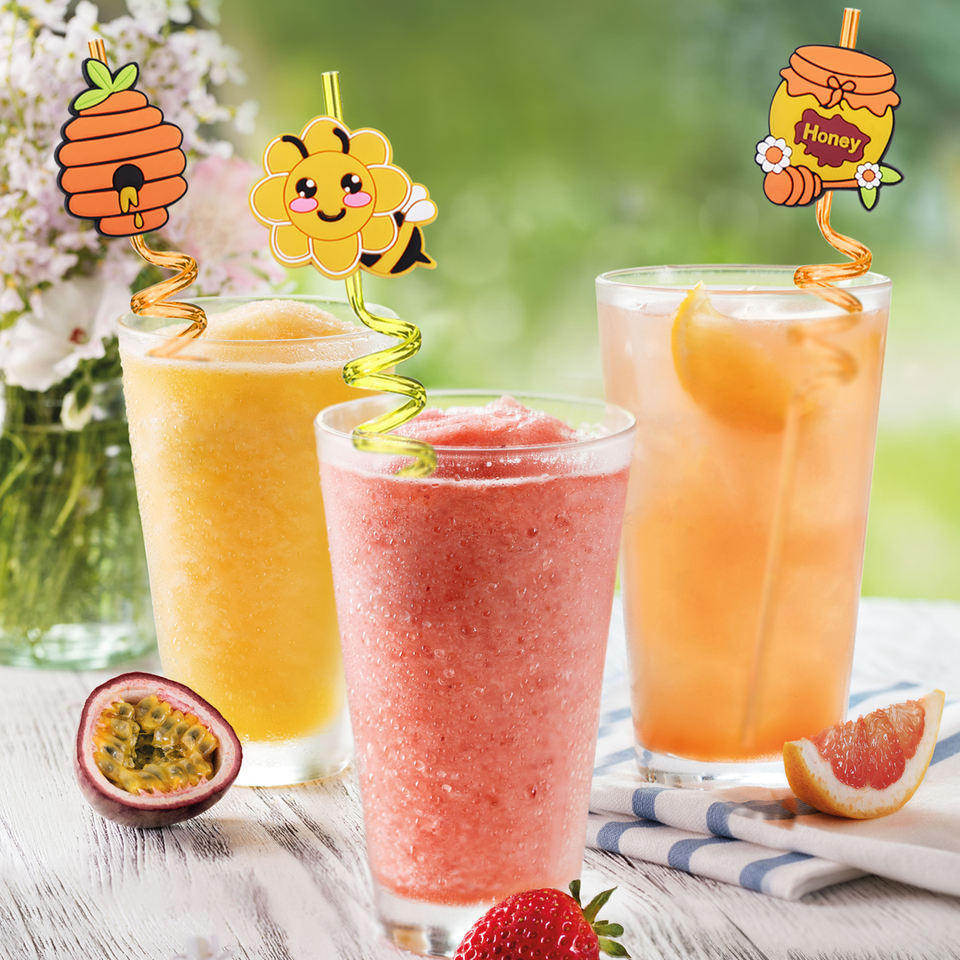 Pailles de fête réutilisables en plastique de qualité alimentaire, motif de dessin animé à la mode, motif en spirale de miel d'abeille, impression numérique