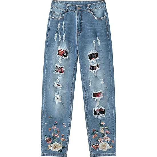 Broderie de fleurs à la mode multi-poches tendance rétro pantalon droit jeans pour femmes