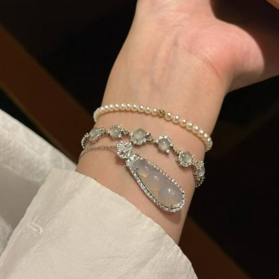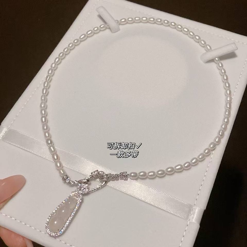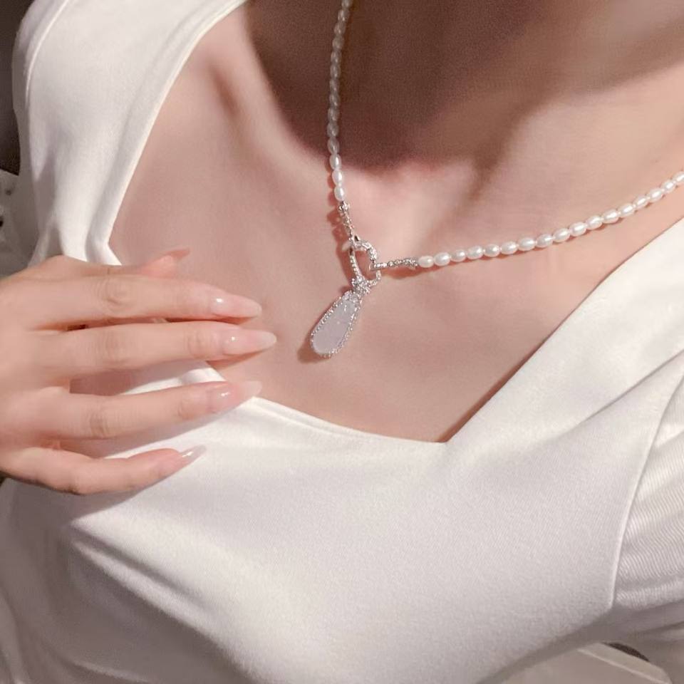 Fashionable Luxurious Women's Fine Pendant Necklace Freshwater Pearl Collarbone Chain Jade Pulp Lucky Beans for Mother's Day
