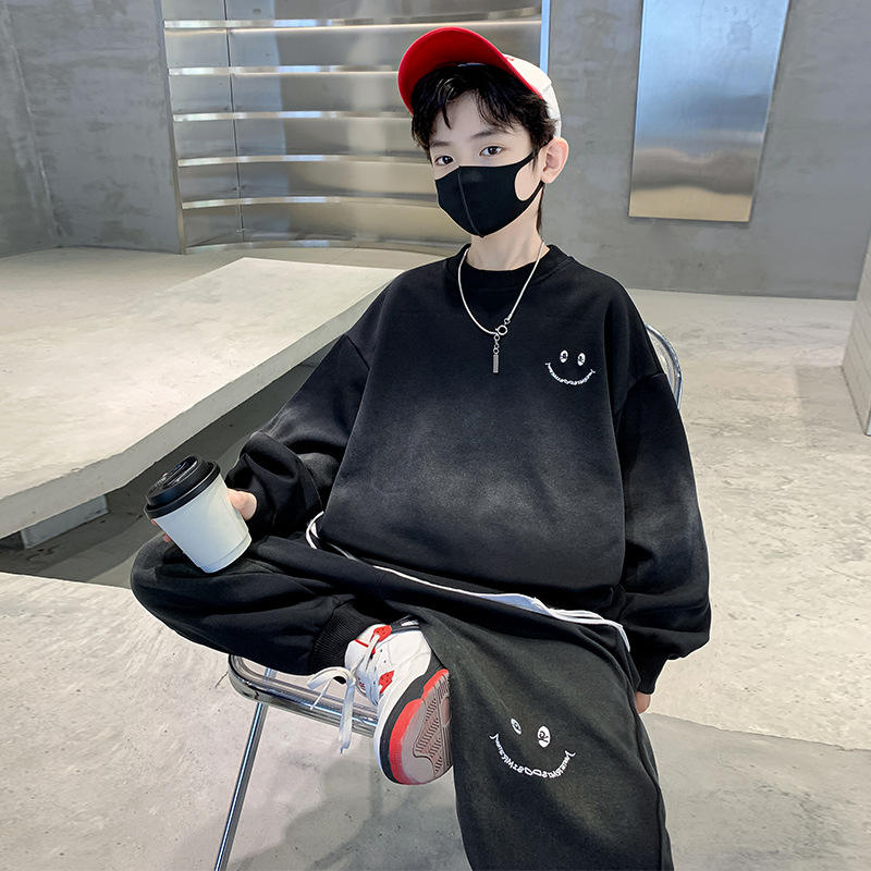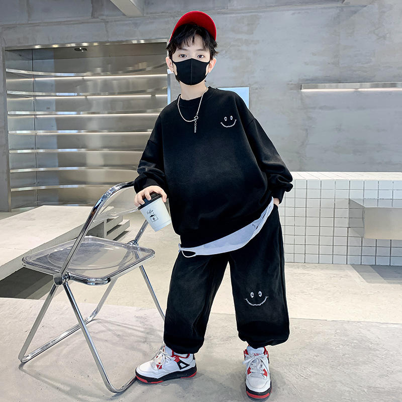 Survêtement de sport à la mode avec pull et pantalon imprimés visage souriant Ensembles de vêtements pour garçon noir pour l'automne