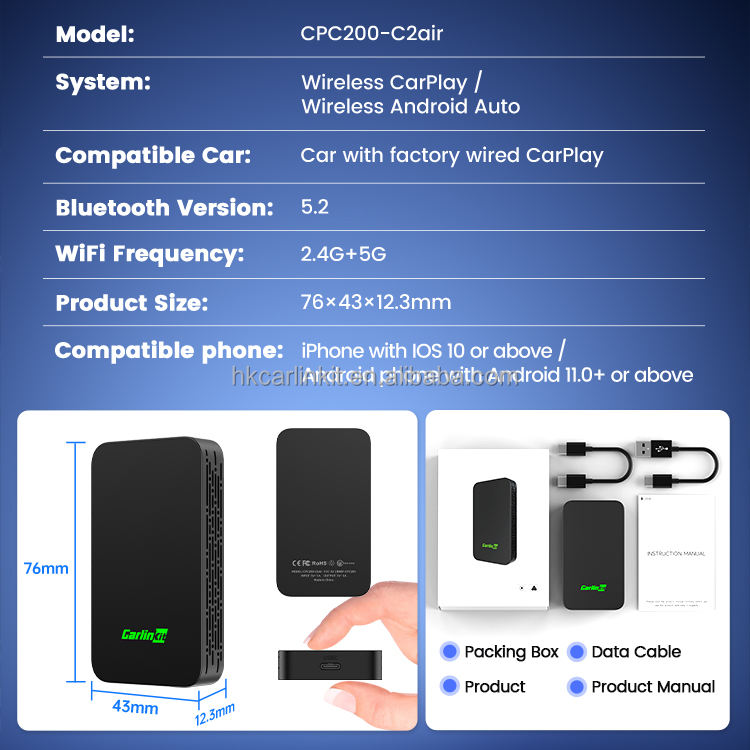 Adaptateur sans fil CarPlay Carlinkit C2Air avec connectivité rapide, appels Siri, OTA, puce stable, boîtier intelligent AI, compatible Android Auto, Apple CarPlay, Apple, Spotify