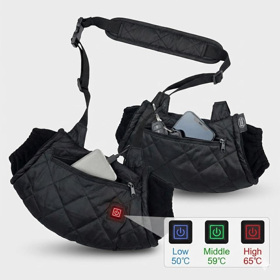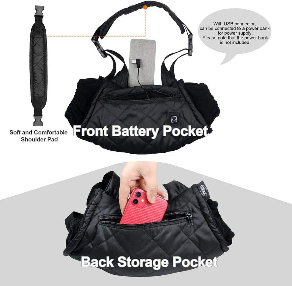 Pochette chauffante rapide doublée polaire avec deux poches zippées, interface USB 5V, contrôle de la température à 3 vitesses, affichage LED, bandoulière souple