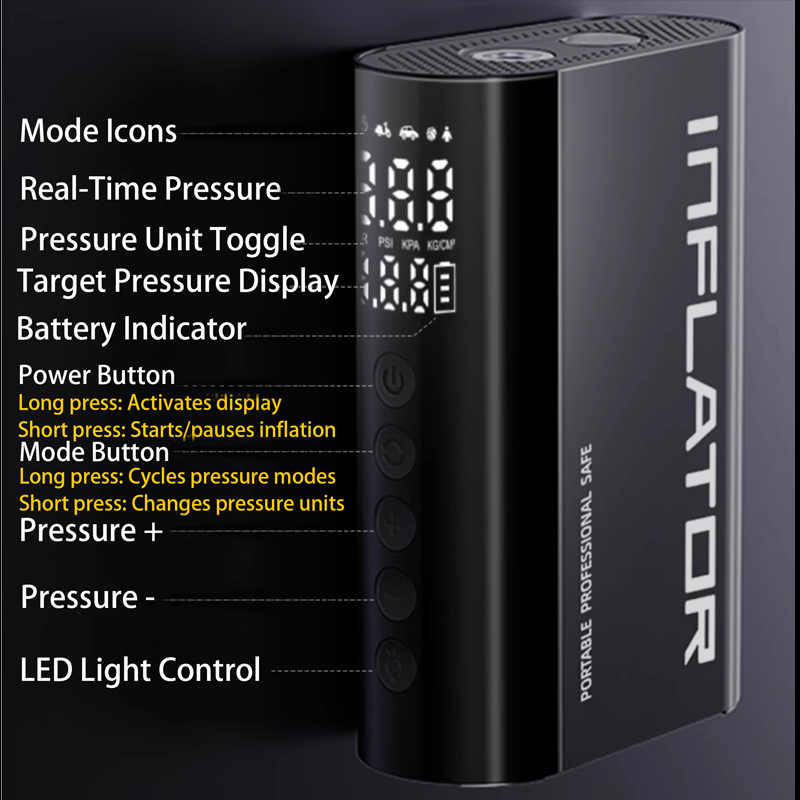 Lumière De secours, Indicateur de puissance, Moniteur de Pression des pneus, Portable, Arrêt automatique, Gonfler rapidementFonction