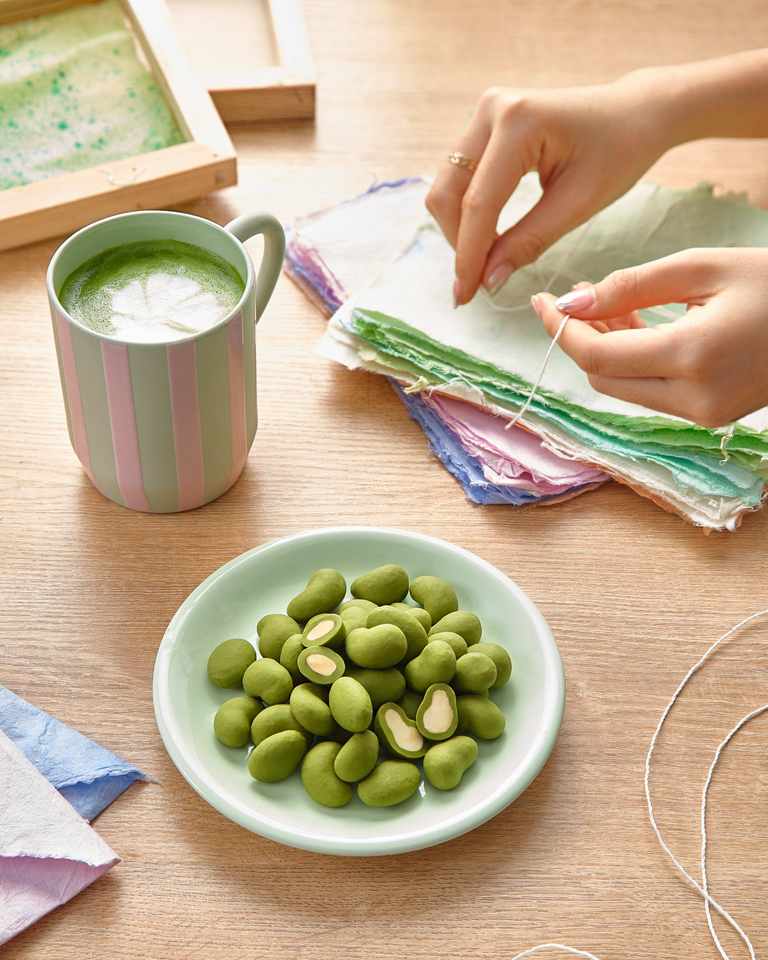 Contenu :Noix de cajou et amandes enrobées au chocolat et à la saveur matcha