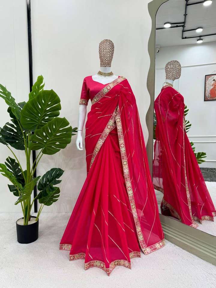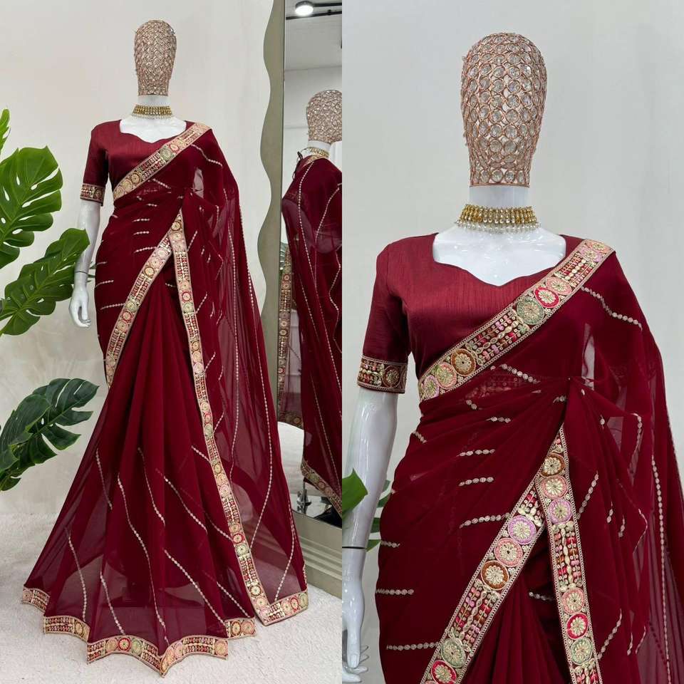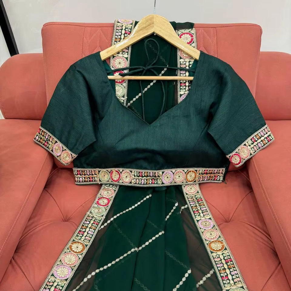 Sari en faux georgette avec travail de séquence et chemisier non cousu en soie mono banglori avec dentelle fantaisie et travail de séquence