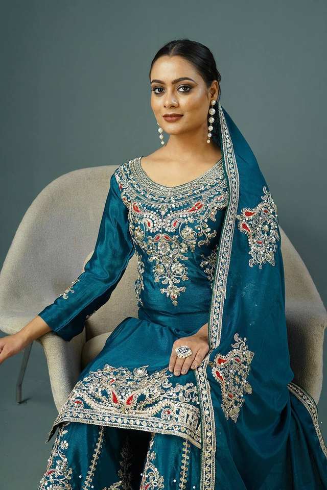 Robe de soirée en Faux Georgette avec travail de broderie perlée et dentelle fantaisie, style indien, Koti Plazo, en viscose pure et soie jacquard, séchage rapide