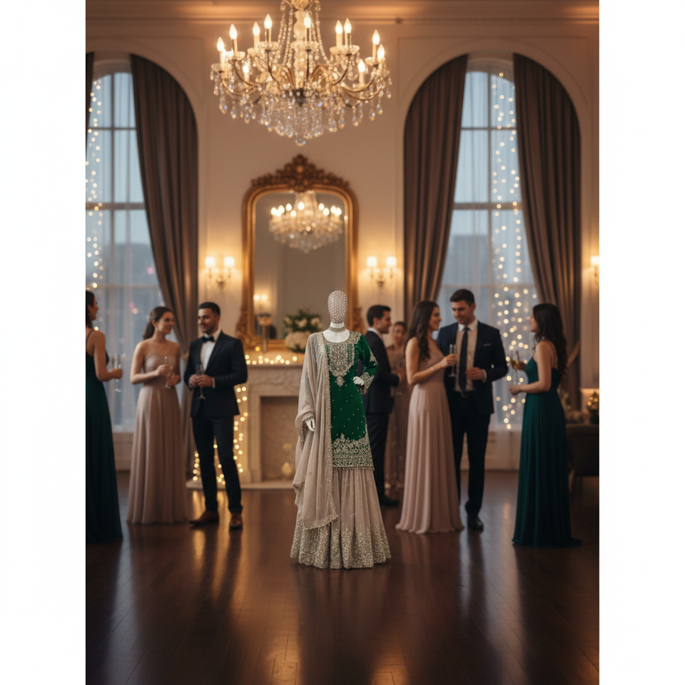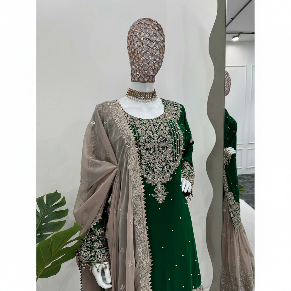 Robe de soirée & Dupatta avec codage en fausse georgette & séquence travail perle & fantaisie dentelle séquence travail codage