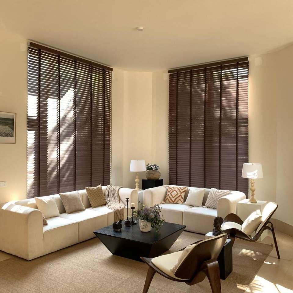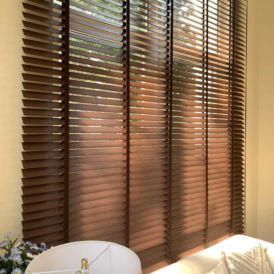 Stores horizontales en faux bois, stores intelligents, rideaux de maison haut de gamme, automatiques, durables, texture en faux bois, lumière parfaite