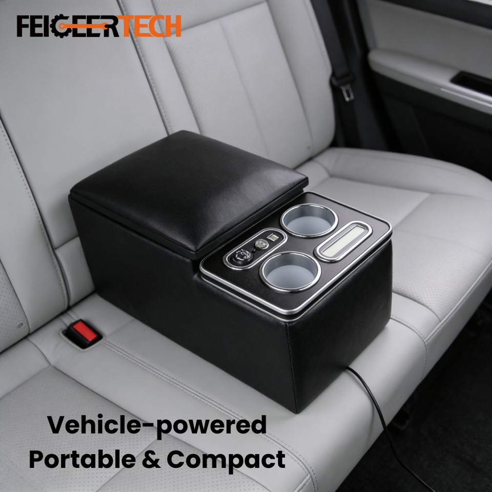 Boîte de rangement universelle pour console d'accoudoir arrière de voiture, alimentée par véhicule, avec recharge sans fil électrique stable Feigeer Tech