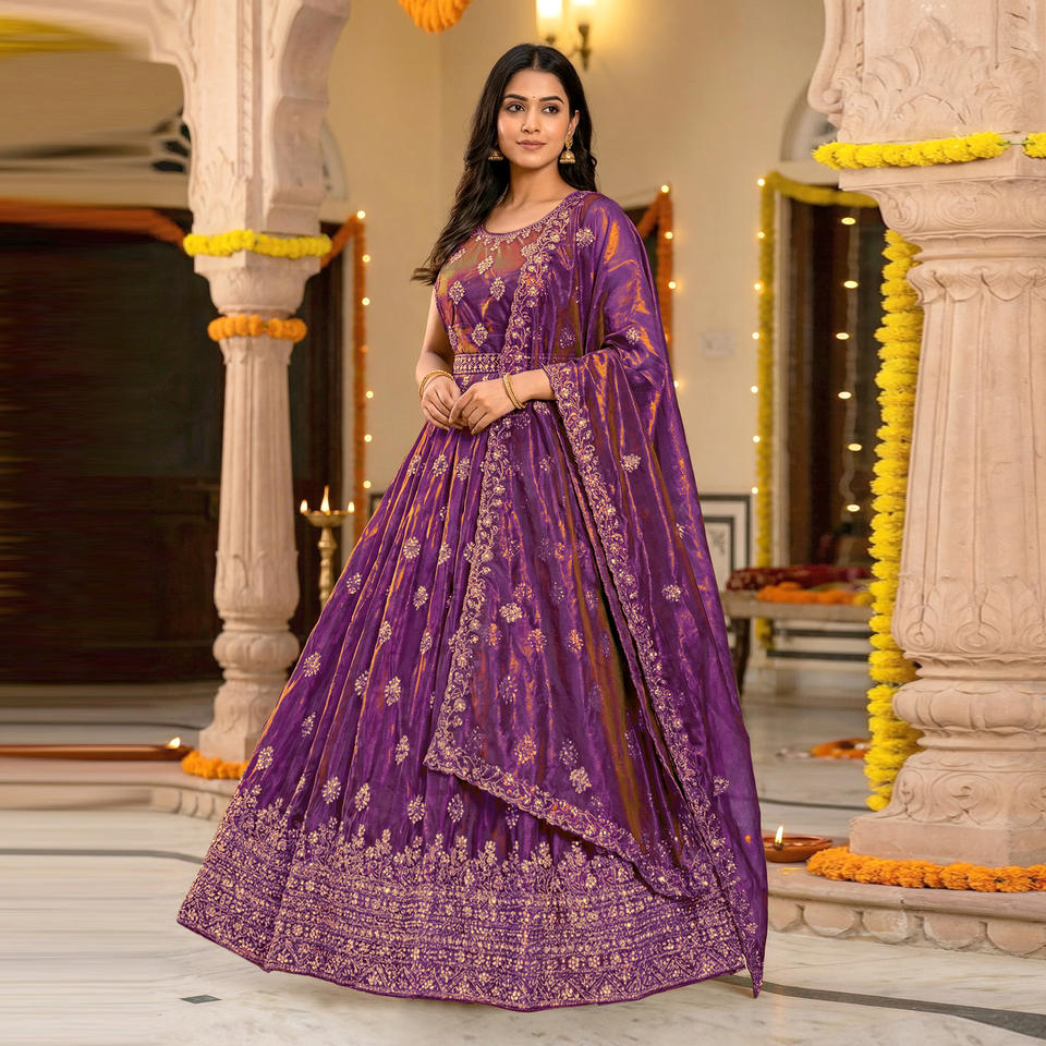 Robe longue en soie Fendy avec broderie Zari détaillée, design évasé, coupe ample, infroissable, et dupatta assorti