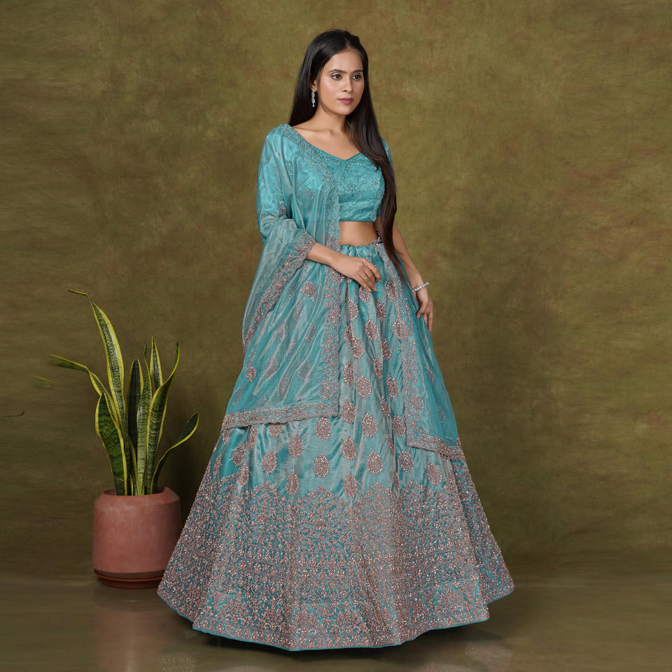 Lehenga Choli en filet Fendy | Motifs de sequins en fil tressé complexe | Ourlet richement orné | Ensemble de dupatta pour occasions festives importantes