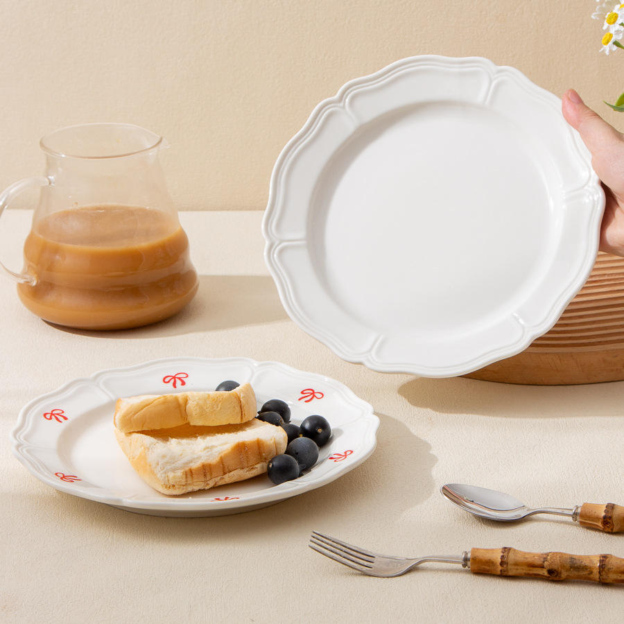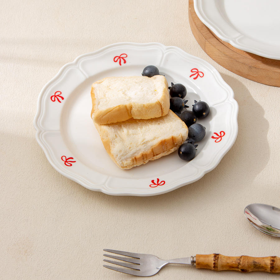 Assiette en céramique blanche Fengxi ronde de 8,5 pouces avec motif de nœud rouge pour servir des desserts, du café, du thé, usage domestique
