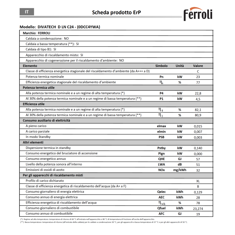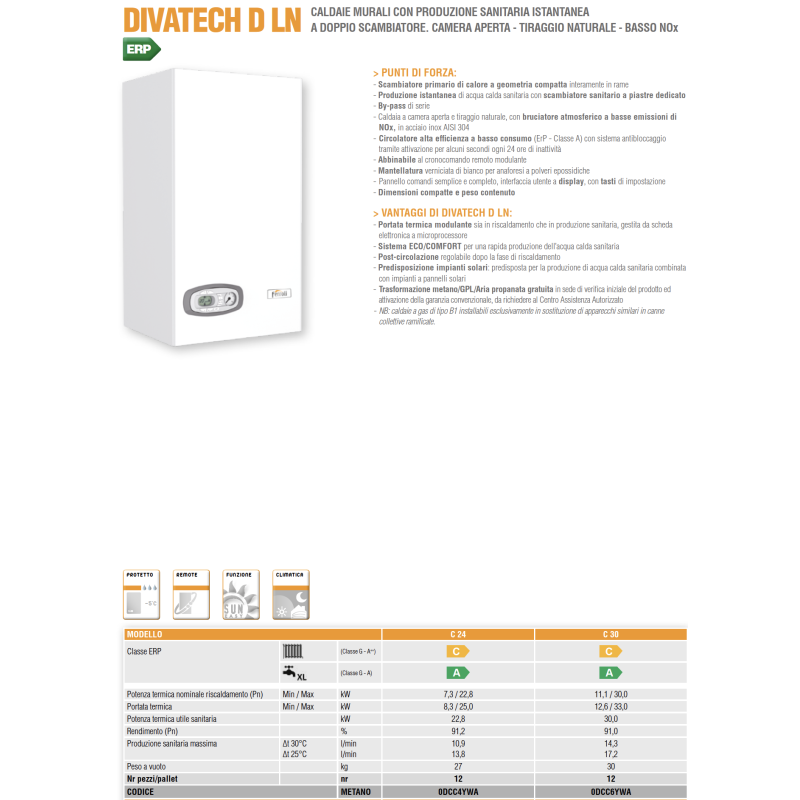 Chaudière à gaz à chambre ouverte Ferroli Divatech D LN C 24 kW ErP pour système de chauffage domestique, compatible méthane ou GPL