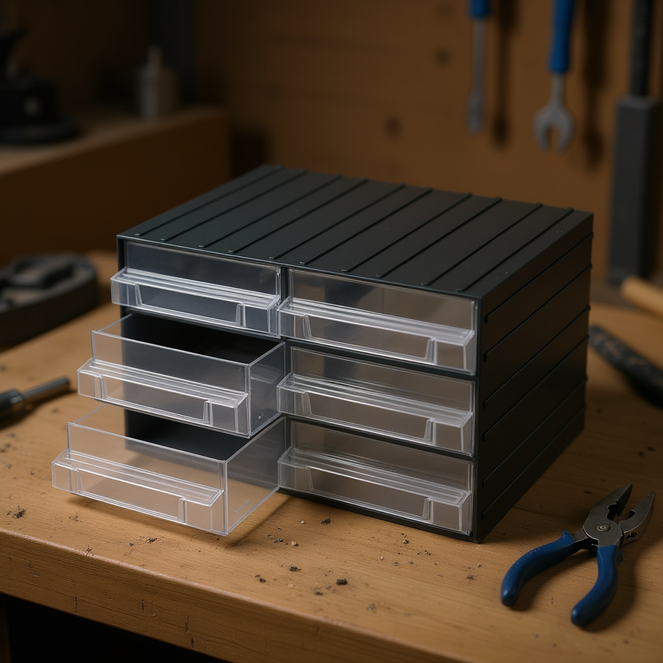 Meuble à tiroirs Fervi avec tiroirs coulissants transparents pour le rangement d'outils