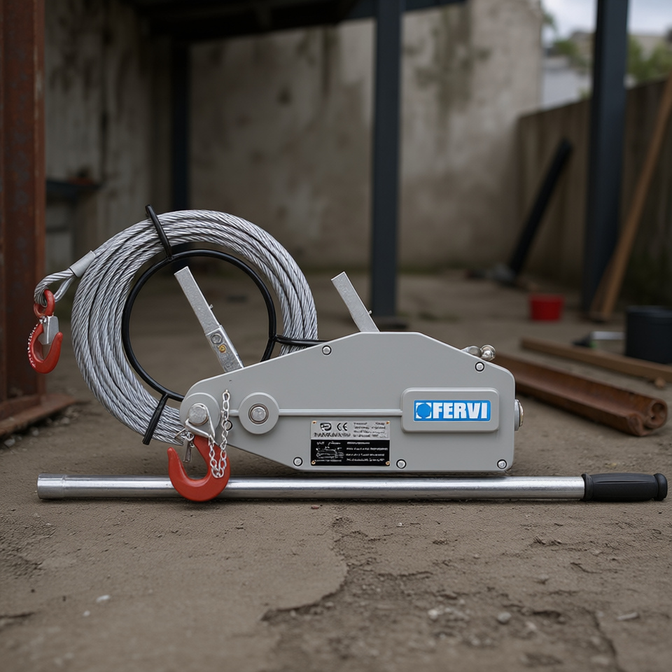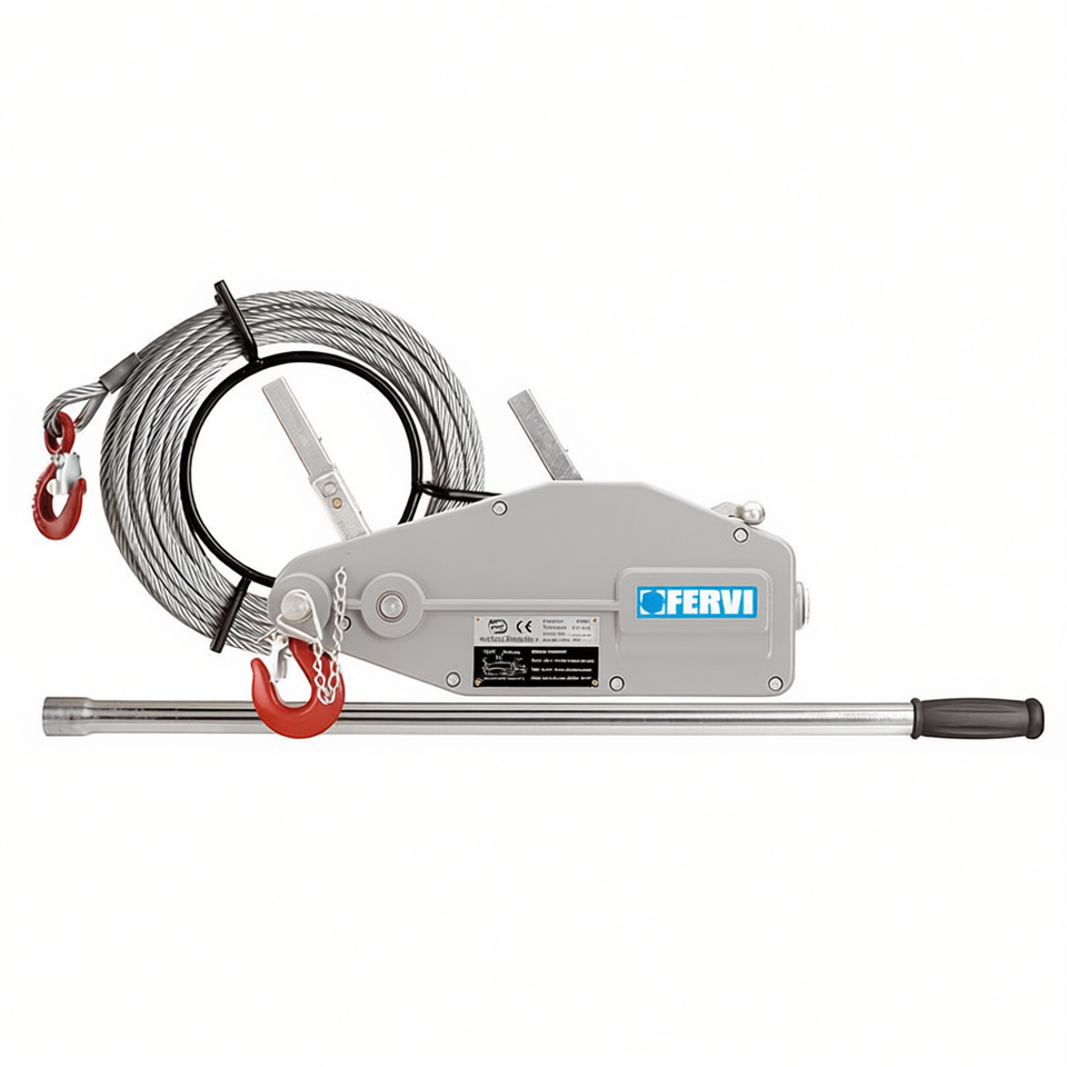 Treuil manuel Fervi, capacité 1000 kg, câble en acier avec crochet et poignée pour applications de levage et de remorquage