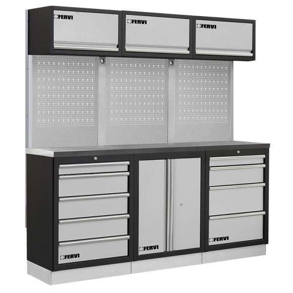 Meuble d'atelier modulaire Fervi A008N, armoire de rangement métallique verrouillable avec panneau perforé et tiroirs pour usage en atelier
