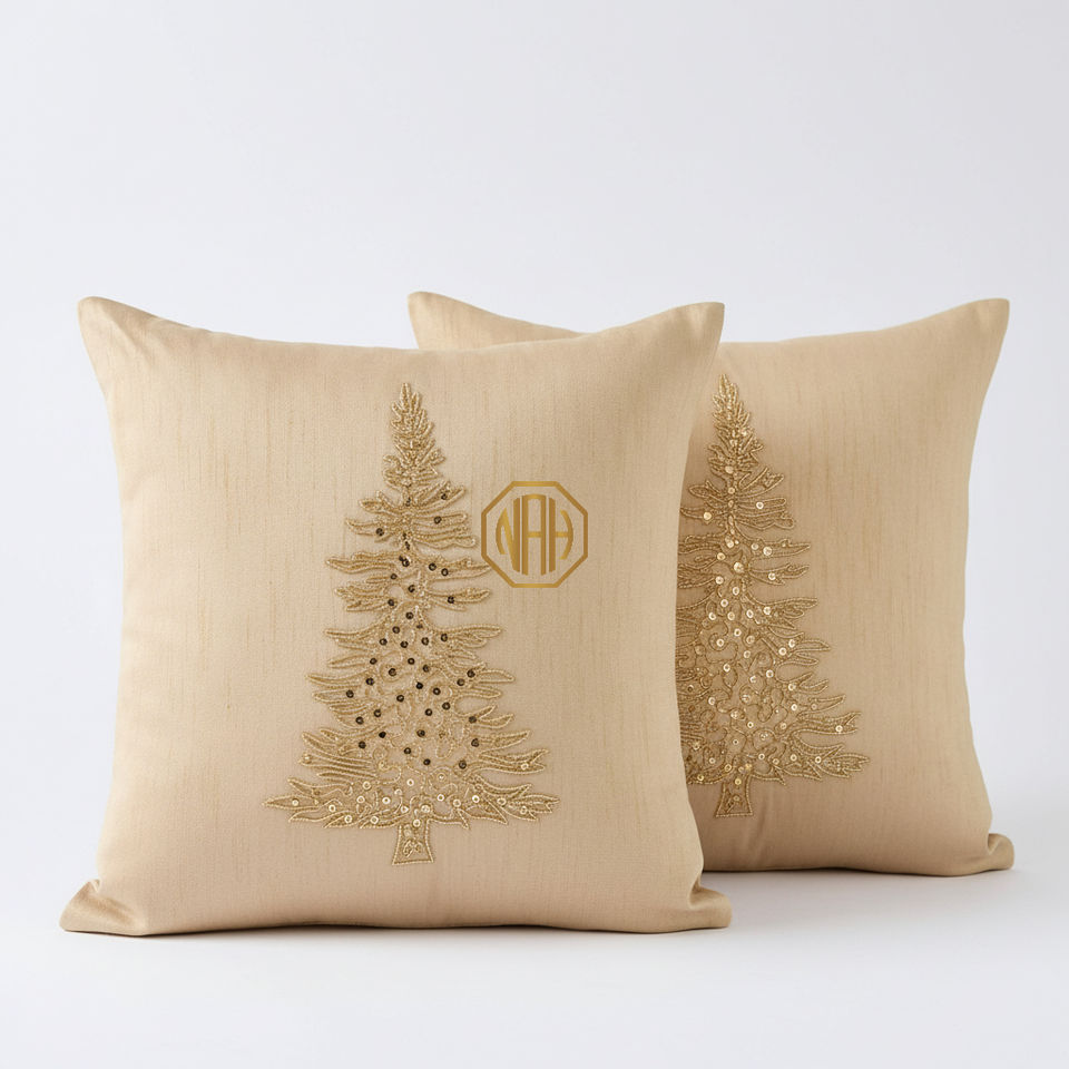 Housse de coussin décorative brodée de motifs de sapins de Noël dorés, faite à la main, en patchwork, de qualité supérieure, personnalisable