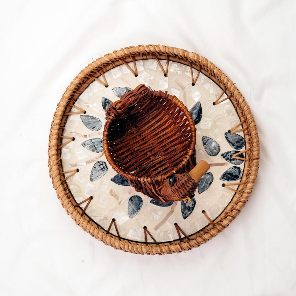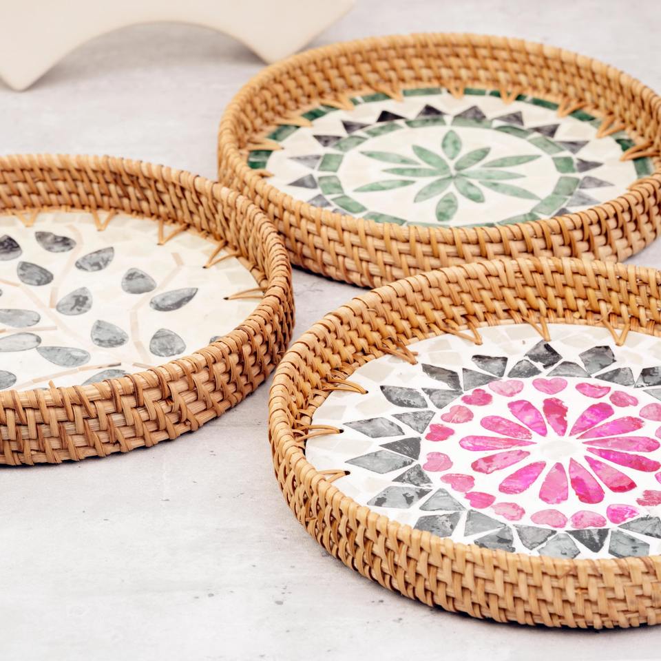 Plateau artisanal en rotin et coquillages pour la saison des fêtes, plateau rond rustique, décoration écologique pour la maison, utilisation pour les repas et les fêtes