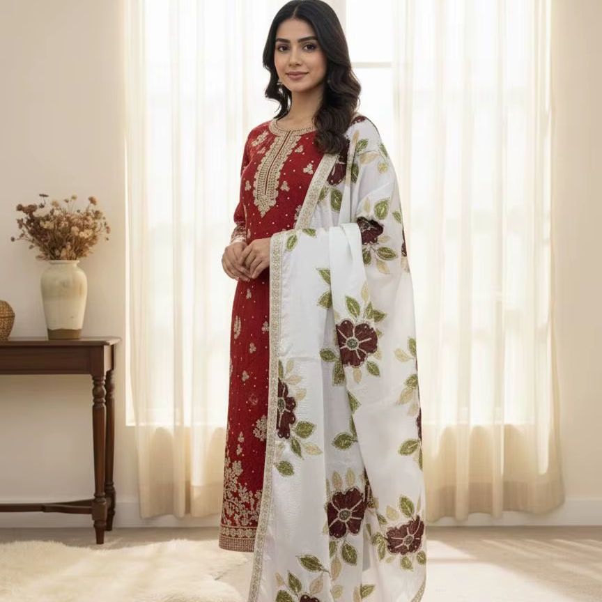 Détails du Dupatta:Tebby Organza avec broderie de sequins et bordure en dentelle