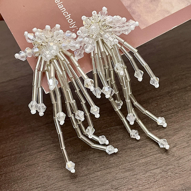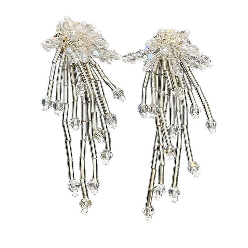 Boucles d'oreilles pendantes en alliage de zinc avec fausses perles de cristal style « Fever » et pompon blanc, bijoux de luxe pour femme pour les soirées