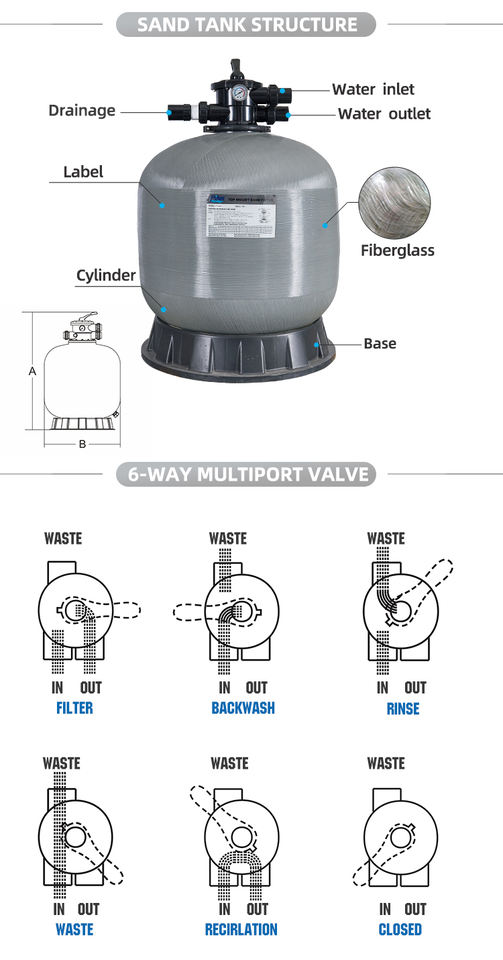 Filtre à sable à montage supérieur en fibre de verre pour accessoires de traitement de l'eau de piscine Modèle