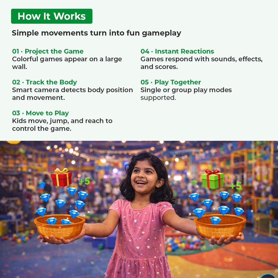 Système de jeu interactif de suivi corporel Fill The Basket pour les aires de jeux intérieures pour enfants, kit de jeu numérique à capteur de mouvement – INEK00031