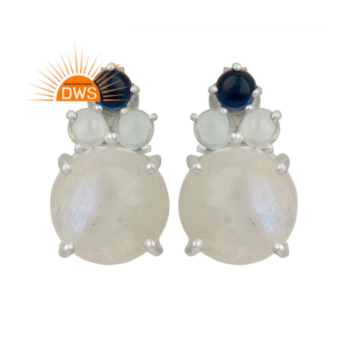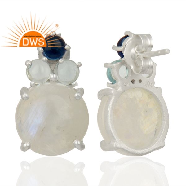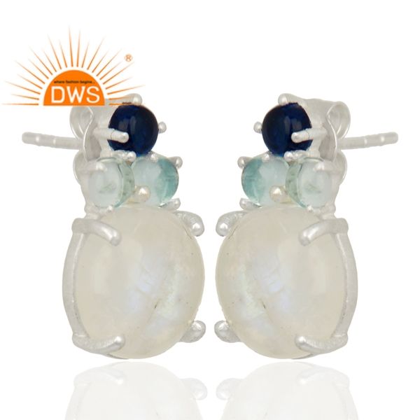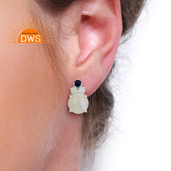 Boucles d'oreilles clous en argent sterling 925 avec pierres précieuses naturelles (pierre de lune arc-en-ciel et topaze bleue) pour femme - Certifiées, tendance, cadeau idéal pour les fêtes