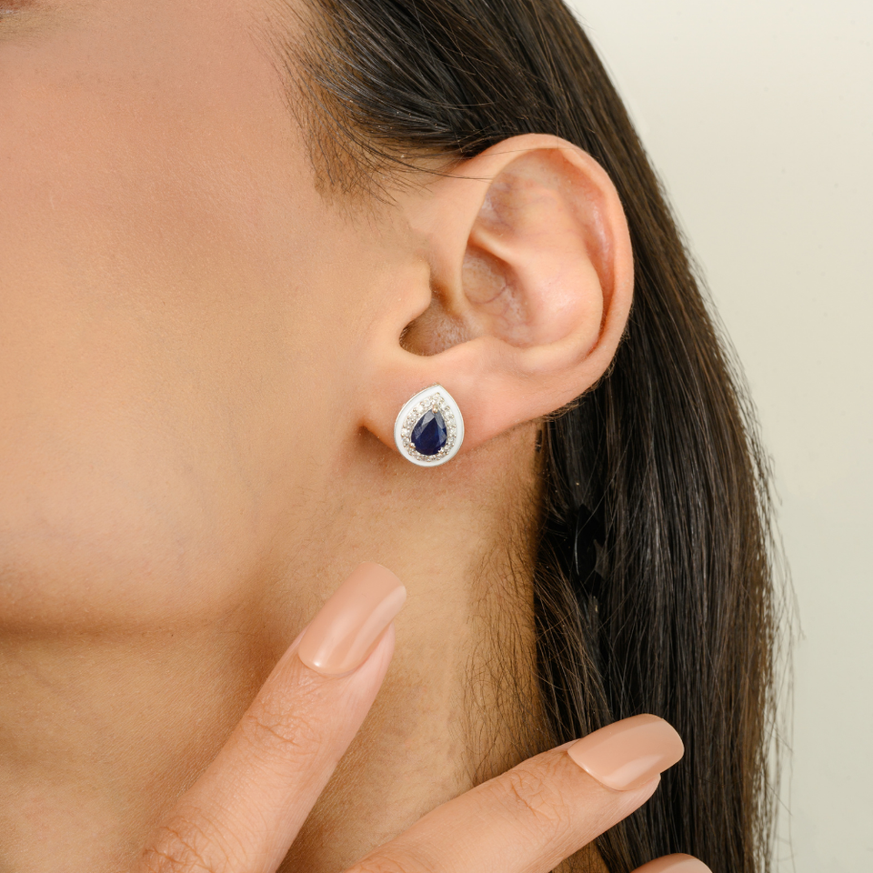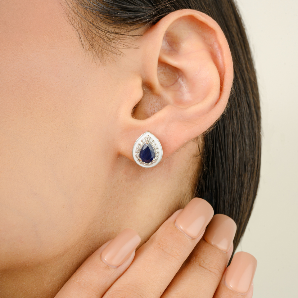 Fine haute qualité classique vente chaude véritable saphir bleu et diamant 14K or blanc larme cluster Halo boucles d'oreilles pour les femmes