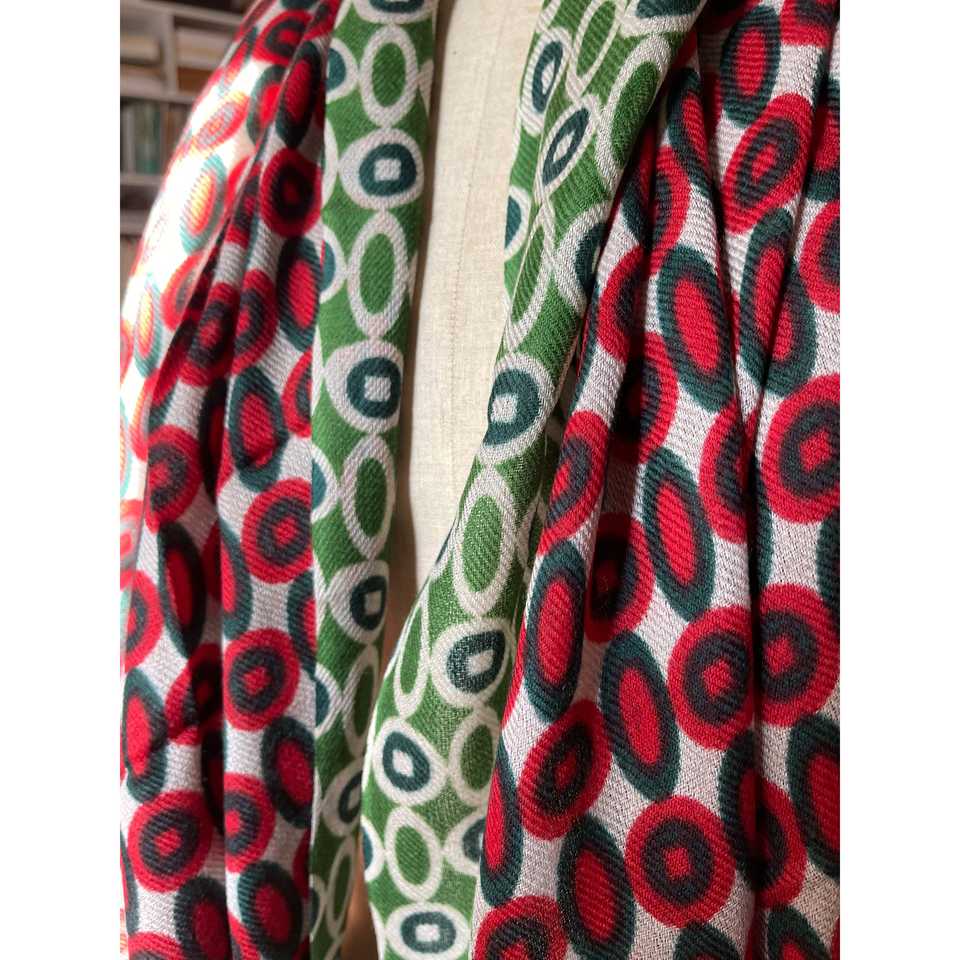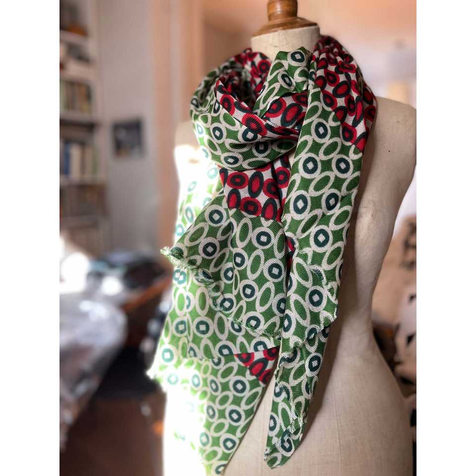 Manteau ou vêtement long en fine laine mérinos, vert, imprimé, style géométrique