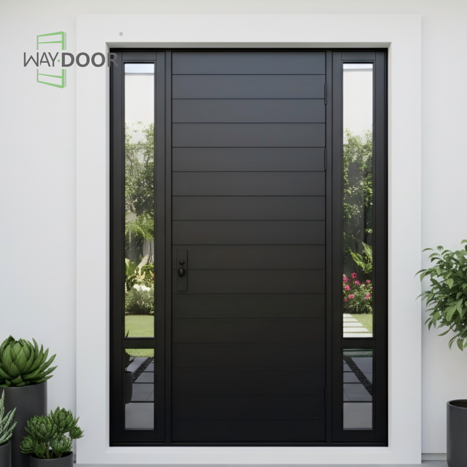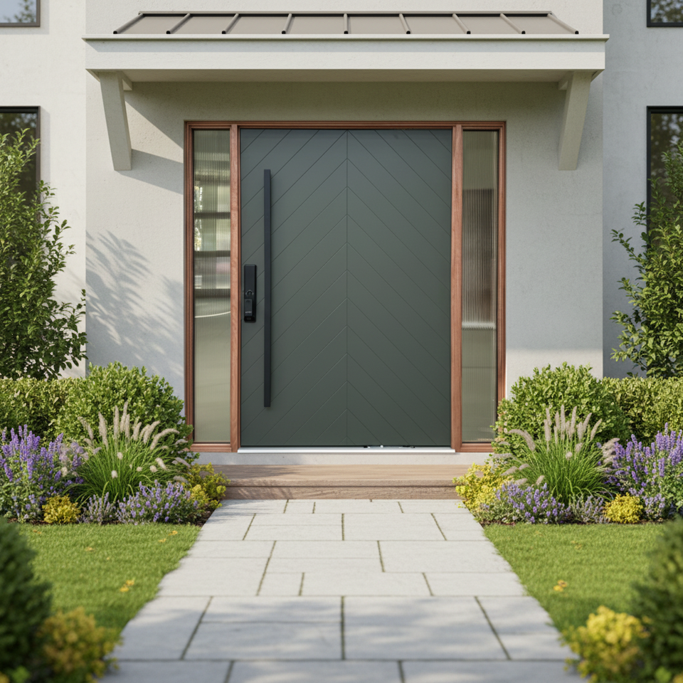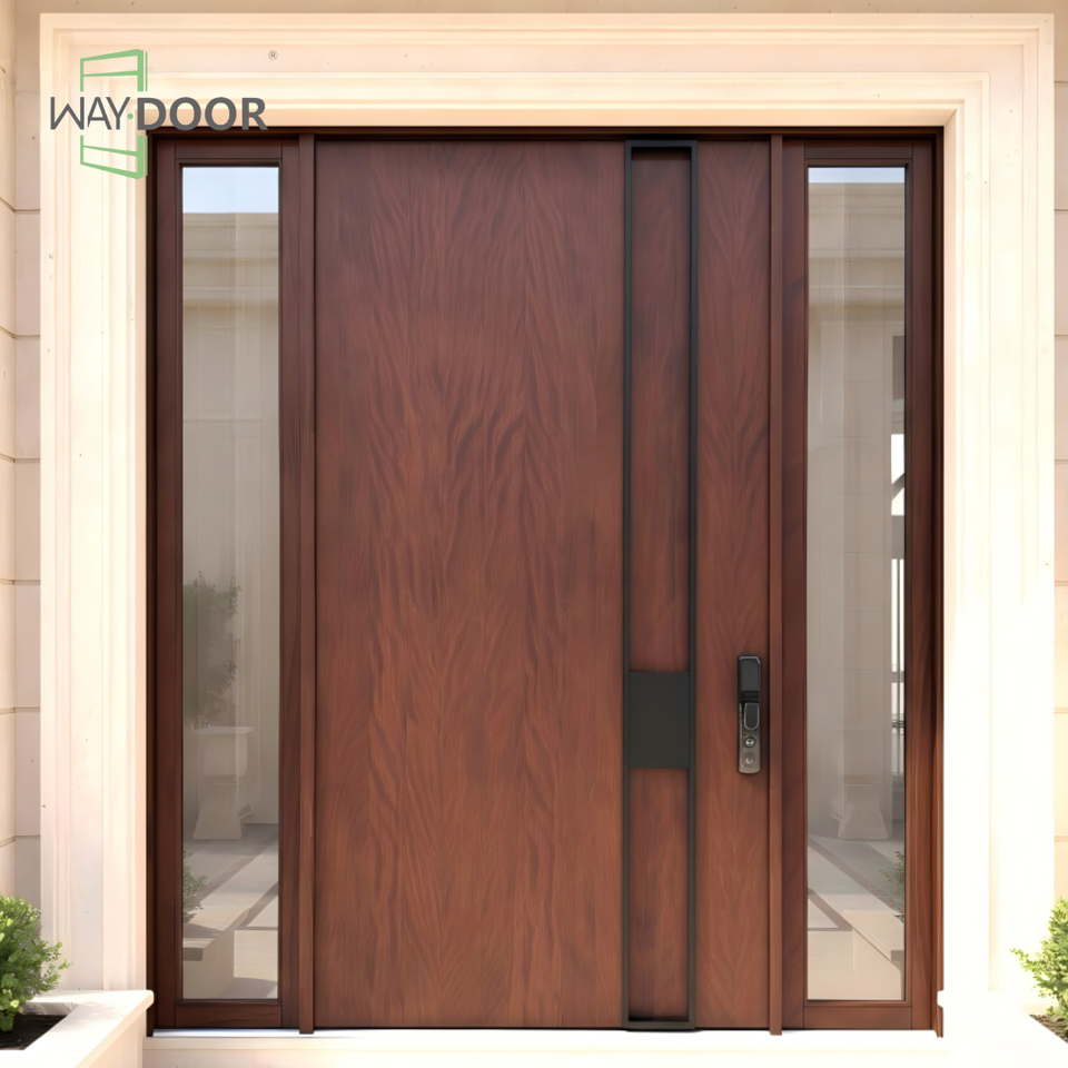 Porte d'entrée en bois massif acajou et chêne, finition usine, avec double vitrage latéral, insonorisée, à pivot unique