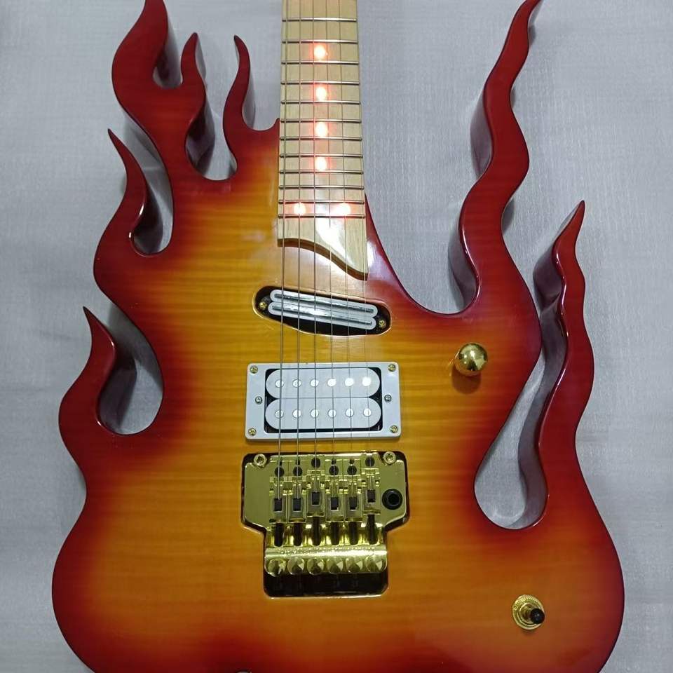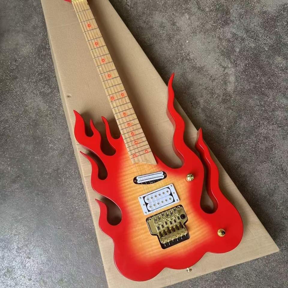 Guitare électrique couleur feu avec touche en érable Finition mate Mécanisme à double action Lumières LED Chevilles d'accord entièrement fermées