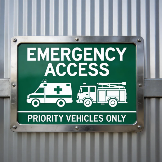 Signalisation de voie de circulation et d'accès d'urgence avec bordure rouge et symbole interdiction de stationnement strict, en métal durable