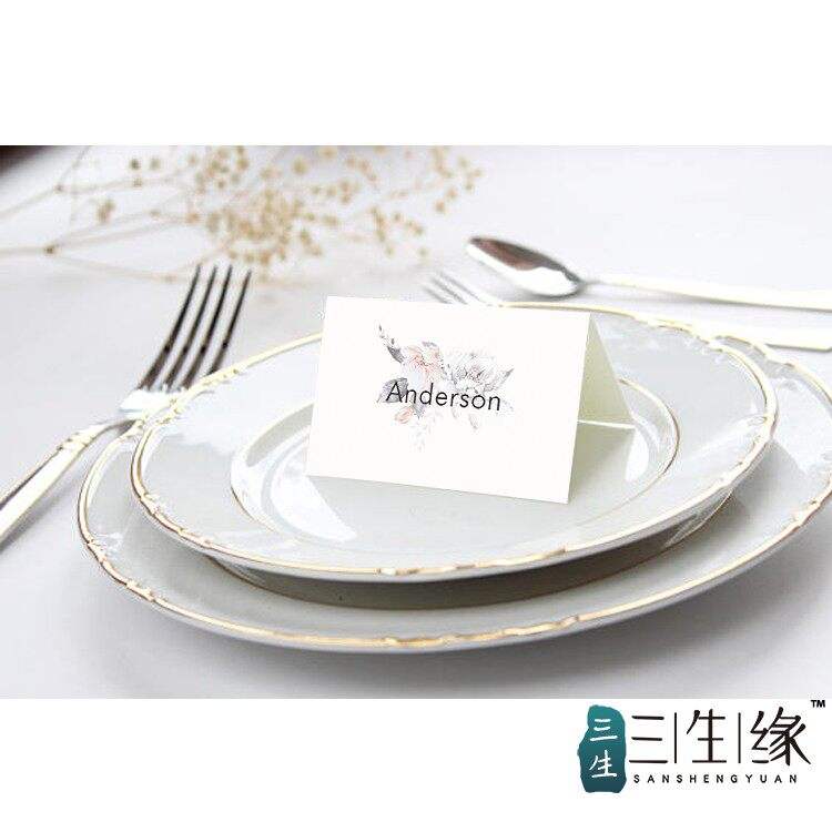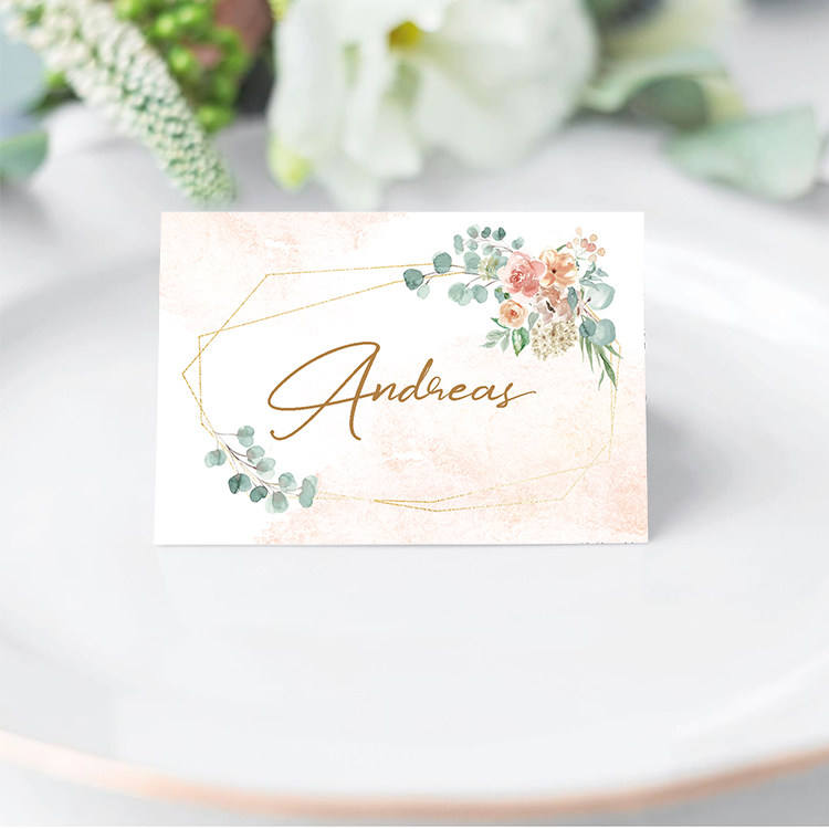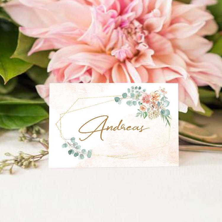 Cartes de nom de table et de réception de mariage haut de gamme personnalisées, estampées à chaud, style rose, collection First Love
