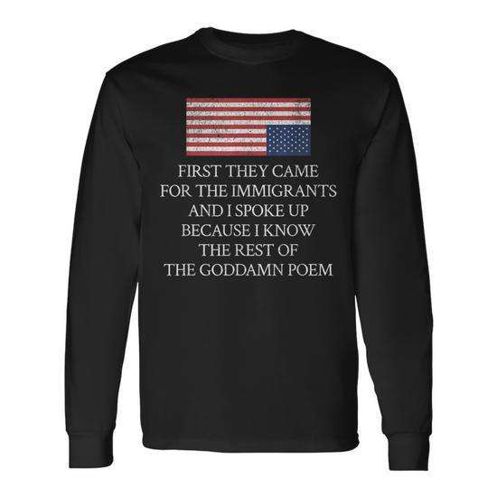 T-shirt promotionnel à manches longues avec poème « First They Came for the Immigrants »