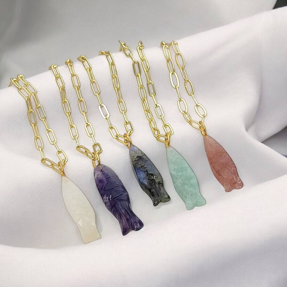Nom ou mots:Pierre précieuse poisson sculpture collier 25x8mm sculpté plaqué or pendentif à la main bijoux en vrac gros animaux charmes