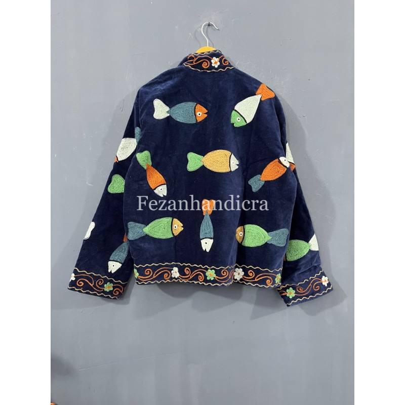 Veste matelassée d'hiver unisexe broderie de poisson Suzani tissu de velours fait à la main traitement tricoté support de fête en coton séchage rapide