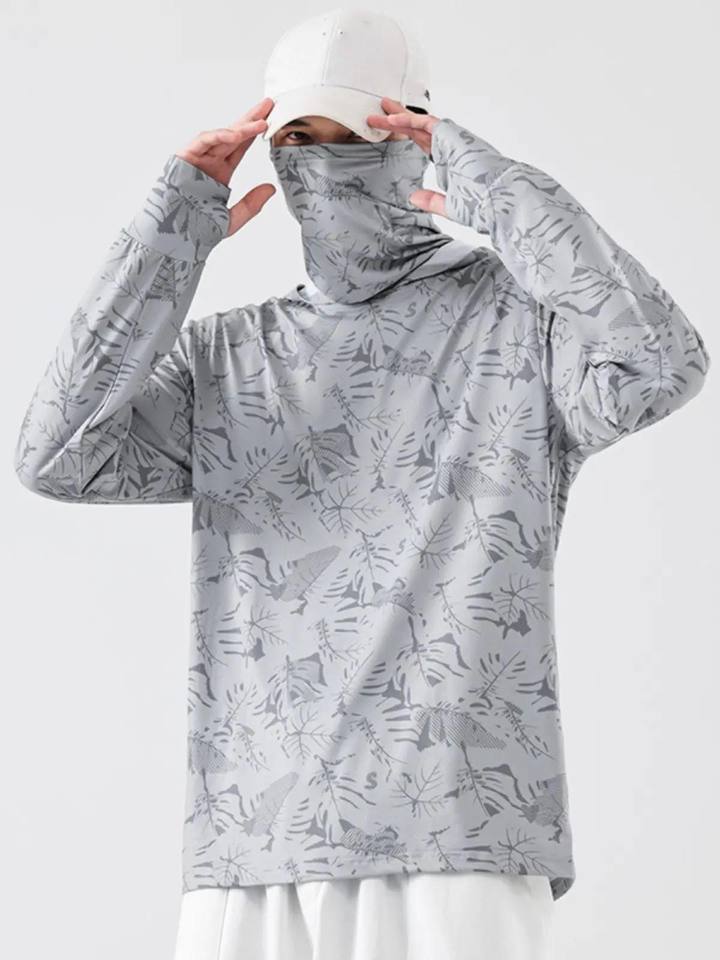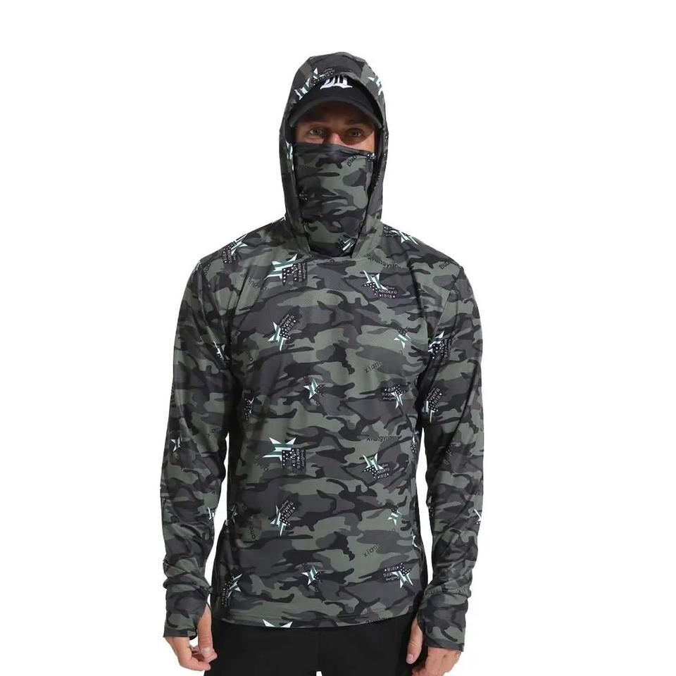 Vêtements de pêche OEM en gros, protection respirante, chemise de soleil camouflage à capuche avec masque, manches longues, design personnalisé