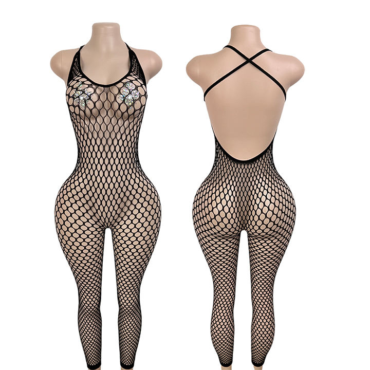 Tenue de danse exotique intégrée avec filet de pêche et croisement au cou pour femme, idéale pour la danse de salon et la danse de strip-tease