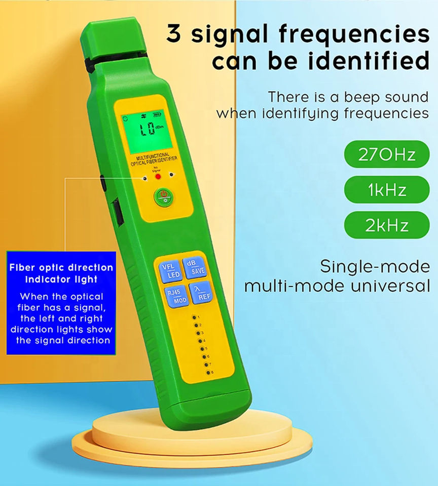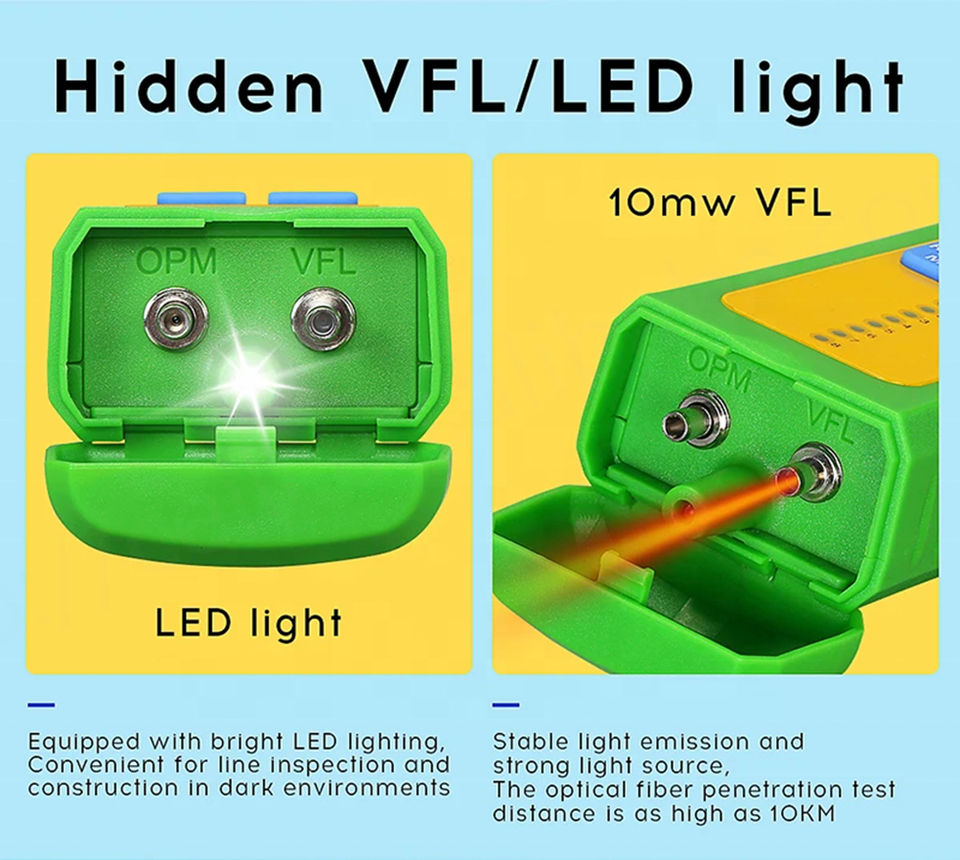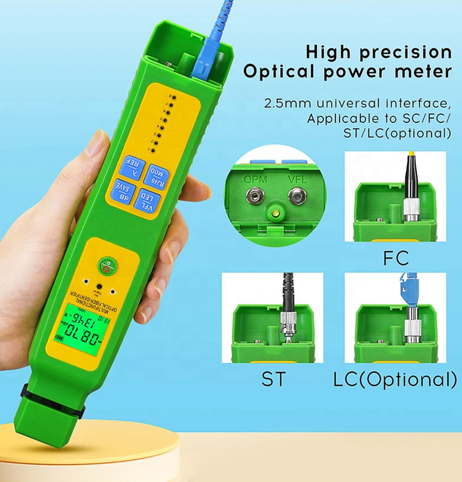 Identificateur de fibre optique cinq en un + 10MW VFL + lumière LED et test de réseau RJ45 avec compteur de puissance optique