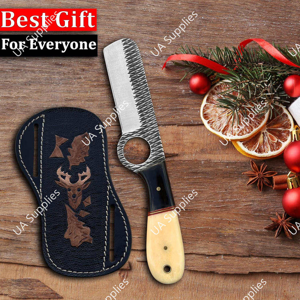 Couteau de chasse/camping à lame fixe en acier inoxydable, dos droit, avec trou pour le pouce, manche en os de chameau et résine, longueur totale 8 pouces, OEM/ODM
