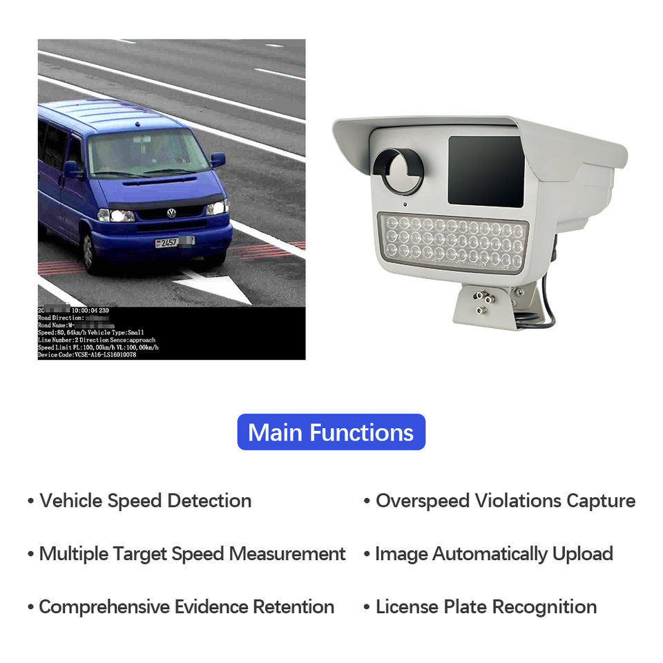 Fonction:Détection de véhicules, Mesure de vitesse cible multiple, Limite de vitesse par classification de véhicule, Reconnaissance des plaques d'immatriculation, Superposition de caractères, Retour d'image