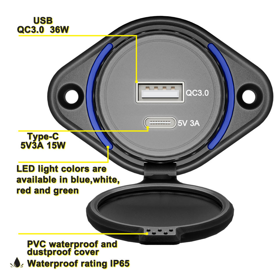 Chargeur USB pour bus, voiturette de golf, camion, à montage plat, double port USB QC3.0 USB-A TYPE-C 5V3.1A, alimentation CC 12/24V